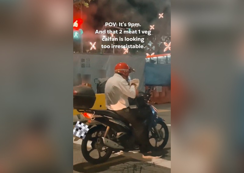 Dinner on the move: Motorcyclist eating 'cai fan' at traffic light sparks discussion on his well-being