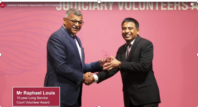 The Singapore Courts (SG Courts) recognised the sterling contributions, time and dedication of court volunteers who support the work of the Courts, at the Judiciary Volunteers Appreciation Lunch on 17 November 2023. Mr Raphael Louis was presented a 10-year Long Service Award by Chief Justice Sundaresh Menon.